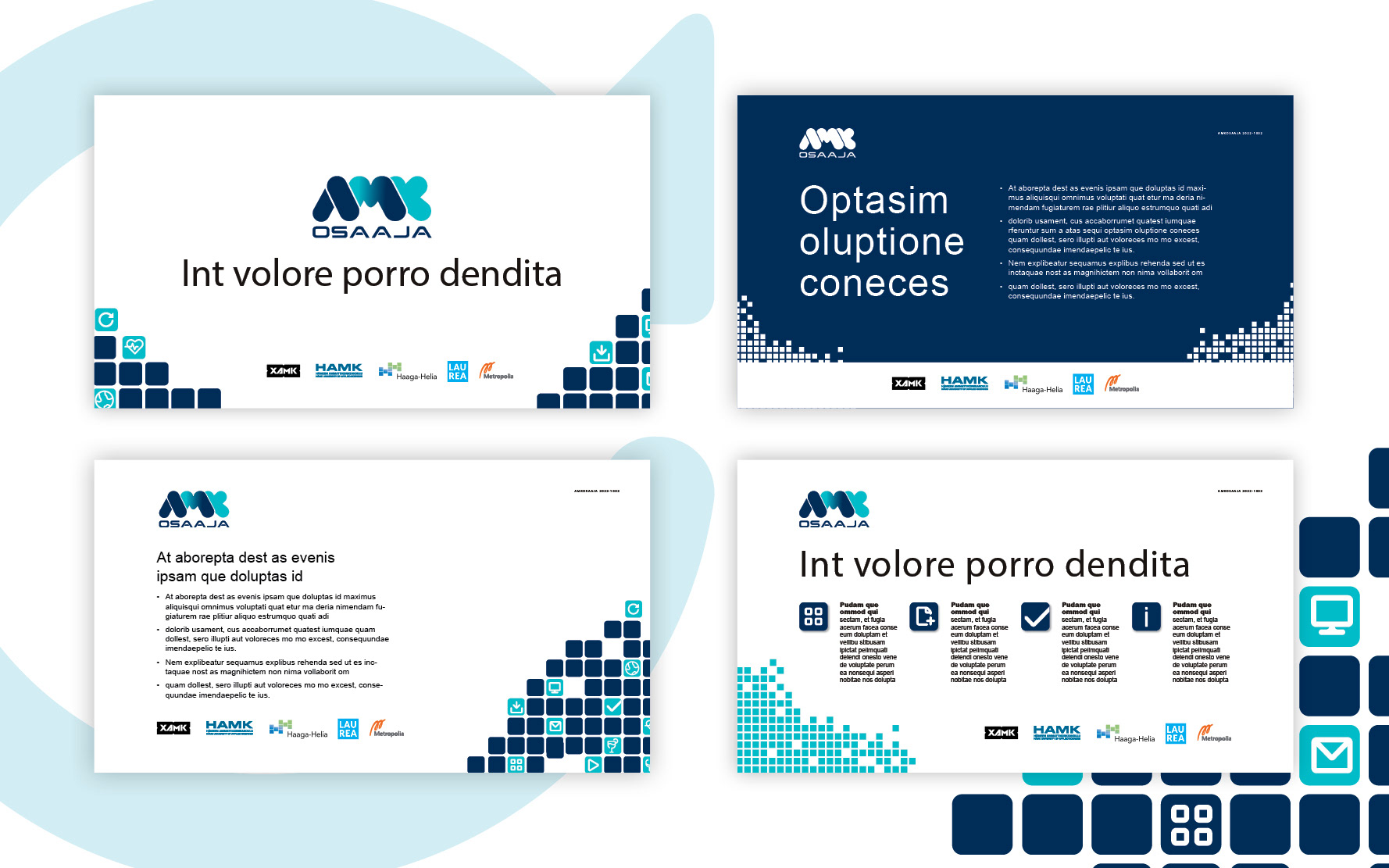Viiden ammattikorkeakoulun yhteiselle hankkeelle suunnniteltu graafinen ilme ja logo sekä Powerpoint-pohja.